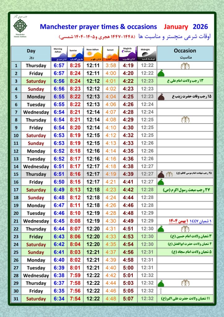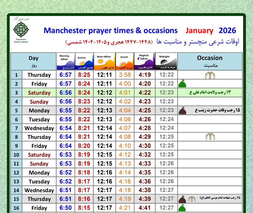 اوقات شرعی شهر منچستر و مناسبت ها – ژانویه 2026
