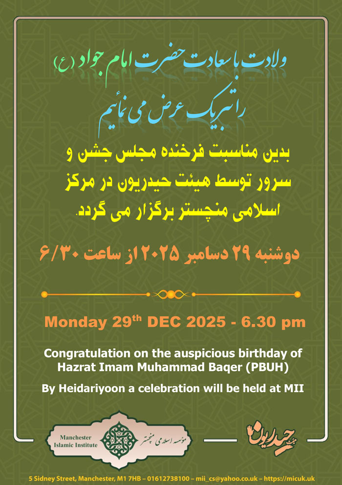 بدین مناسبت فرخنده مجلس جشن و سرور توسط هیئت حیدریون در مرکز اسلامی منچستر برگزار می گردد.