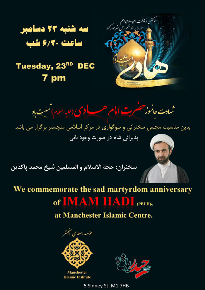 بدین مناسبت مجلس سخنرانی و سوگواری در مرکز اسلامی منچستر برگزار می باشد