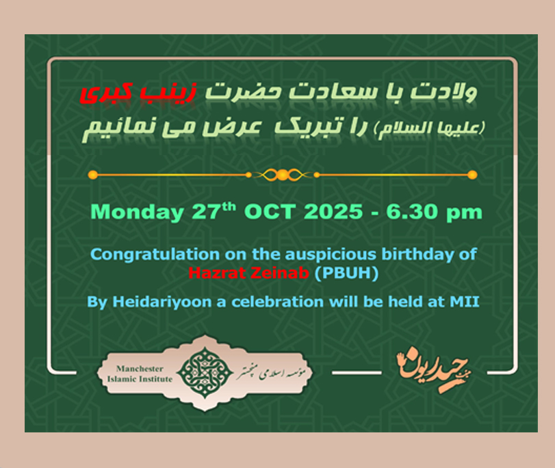 Congratulation on the auspicious birthday of Hazrat Zeinab (PBUH) By Heidariyoon a celebration will be held at MII Monday 27th OCT 2025 – 6.30 pm