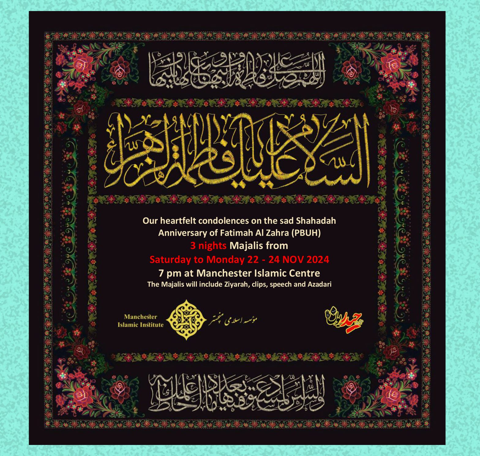 A commemoration Majlis on the sad anniversary of Hazrat Umm ul-Banin (PBUH) demise at MII, Speaker: HWM Pakdin The holy Quran recitation Duaa Kumayl – Speech & Azadari – Dinner Thursday 4th DEC 2025 at 06.30 pm